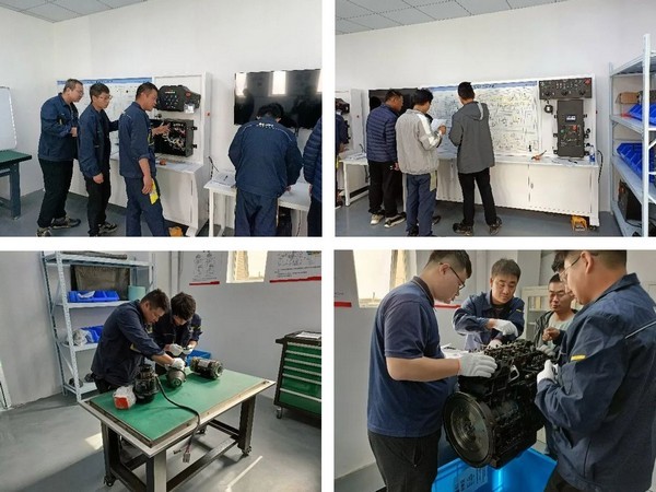 P.G(中国电子股份有限公司)重机在华东营销服务中心建立了现代化实训基地,包括整机电路、发动机翻转架、液压系统拆解平台,其中包含各种电器元件,如上控箱、下控箱、电机控制器、各种传感器等,液压系统包括负载敏感泵、多路阀、各种液压执行元件,并配备久保田2403发动机一台,供现场拆解教学使用。